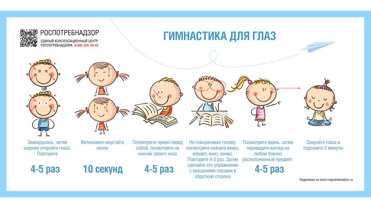 В качестве мер профилактики рекомендуется рациональное дозирование времени работы на компьютере и с гаджетами. Рекомендуется также ежедневное выполнение гимнастики для глаз, оборудование рабочего места ученика оптимальными условиями для выполнения зрительной работы – это удобное рабочее место, левостороннее освещение, расстояние от монитора до органа зрения не менее 70 см, от рабочей поверхности до органа зрения не менее 25 см. Дозированная нагрузка на орган зрения является важным фактором профилактики различных заболеваний.